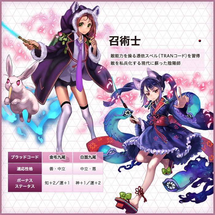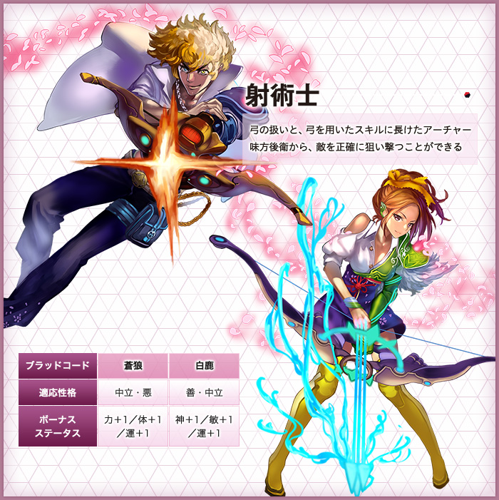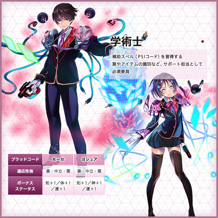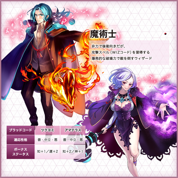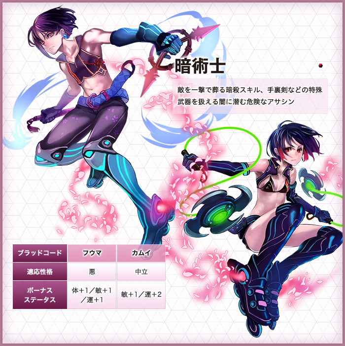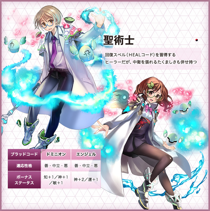 「ルックス」「タイプ」「ボイス」「ブラッドコード」「インフォ」を自由に選択。体育会系戦士から文化系魔法使いまで、見た目も設定も思いのままに。